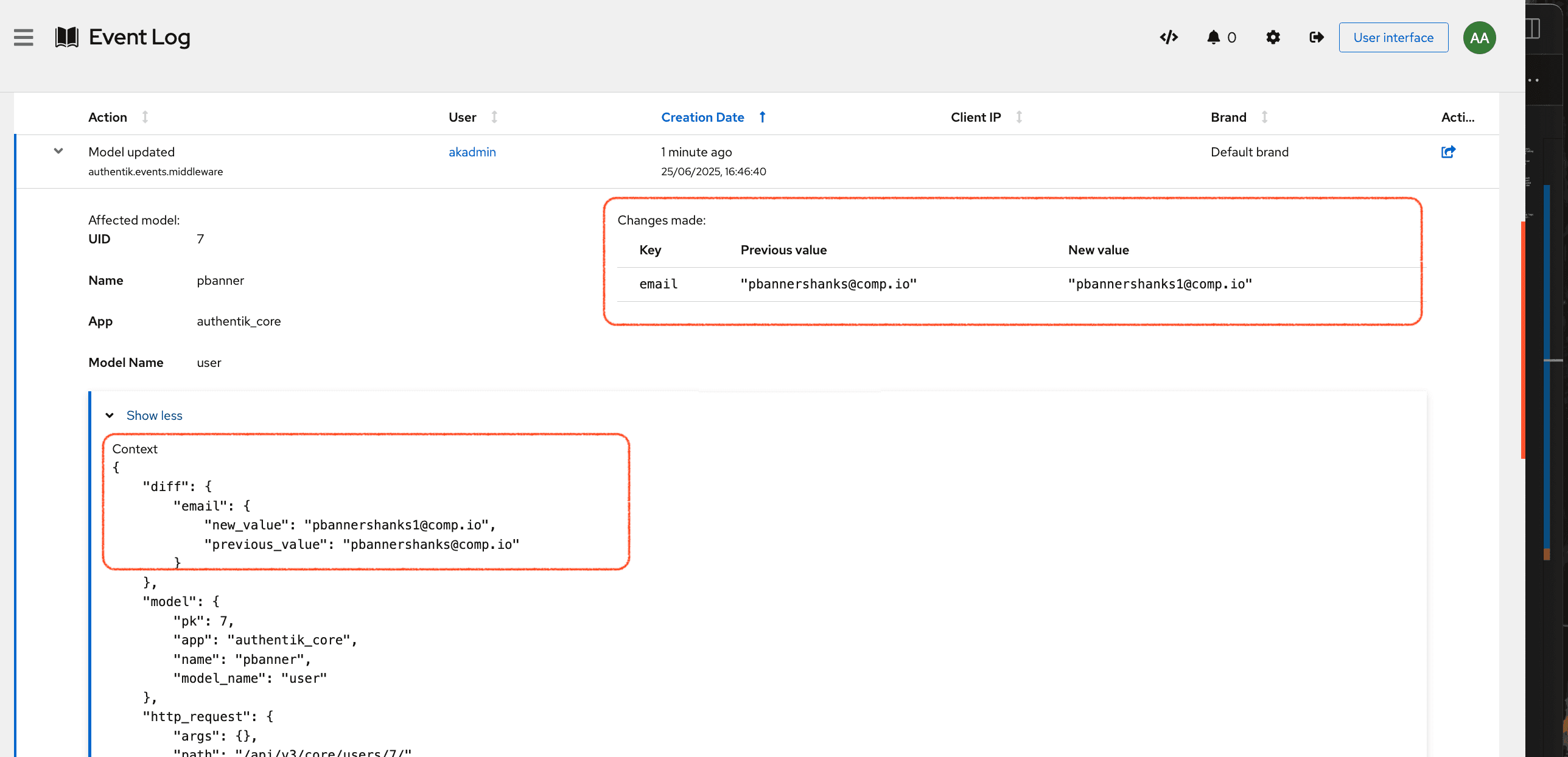 for any event that involves the creation or modification of an object, the corresponding code differences are displayed, allowing for comparison of the previous and new configuration settings or values. For example, if an authentik administrator updates a user's email address, both the old and new email addresses are displayed in the event's detailed view. (In the open source version, event details only show that a change was made and which application and model was involved.)